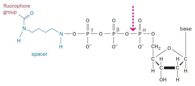 تصویر ۱۰ . dNTP لیبل شده با رنگ فلورسنت به صورت phospholinked؛ فلش خط‌چین شده نشان دهنده محل برش نوکلئوتید هنگام پیوستن به DNA است. گروه پیروفسفات که حاوی گروه‌های فسفات β و γ است، به همراه فلوروفور متصل شده جدا و dNMP به ساختار DNA ملحق می‌شود.