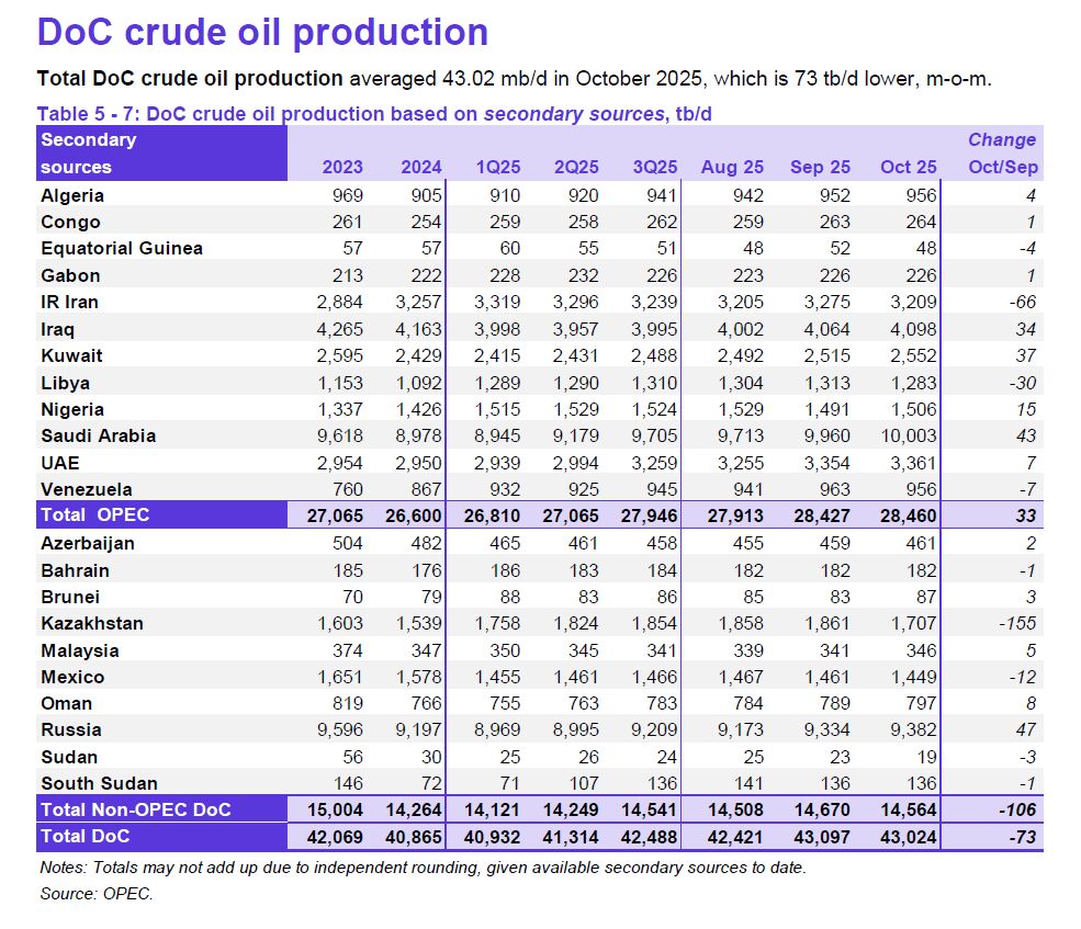 عربستان با تولید روزانه ۱۰ میلیون و ۳ هزار بشکه و عراق با تولید روزانه ۴ میلیون و ۹۸ هزار بشکه تولیدکنندگان بزرگ اوپک در ماه اکتبر ۲۰۲۵ هستند.