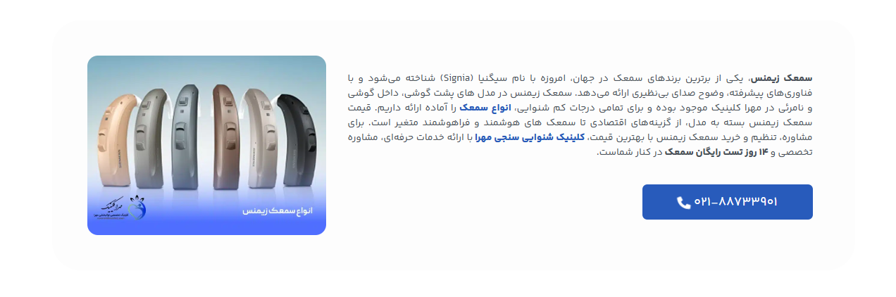 برای دریافت مشاوره تخصصی، ارزیابی شنوایی رایگان و اطلاع از لیست قیمت بهروز سمعک زیمنس و مدلهای جدید سیگنیا، میتوانید با کارشناسان مهرا کلینیک در ارتباط باشید.