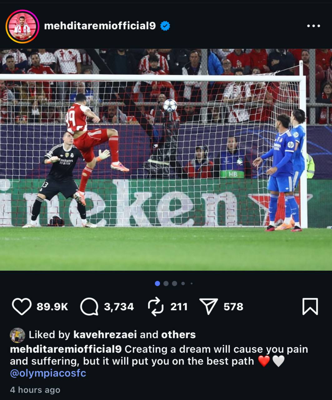 ستاره ایرانی المپیاکوس در پی گلزنی در دیدار لیگ قهرمانان اروپا مقابل رئال مادرید، پستی احساسی و پرمعنا منتشر کرد.