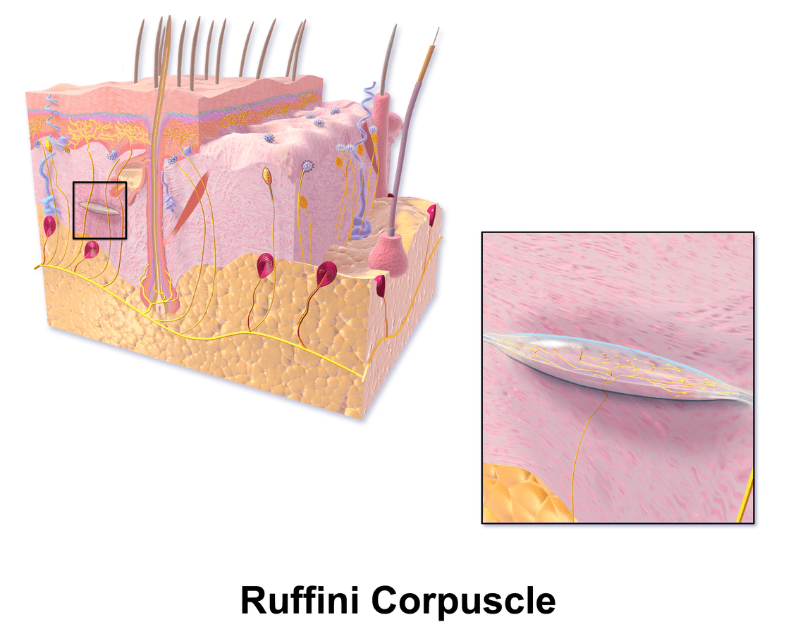 انتهاهای رافینی در لایههای عمقی پوست واقع شدهاند و دفرماسیون مکانیکی مفاصل خصوصا تغییر زاویه را در تغییراتی بالای ۲.۷۵ درجه و شرایطی که فشار مداوم وجود دارد، ثبت میکنند. این گیرنده های حسی پوست همچنین به عنوان انواعی از گیرندههای حرارتی عمل میکنند که پاسخشان طولانیتر است. پس در سوختگیهای عمقی با آسیب این رسپتورها شاهد وجود درد خواهیم بود. با وجود این که انتهاهای رافینی گاها به عنوان رسپتورهای حرارتی شناخته میشدند، این رسپتورها در واقع مکانیکی هستند.